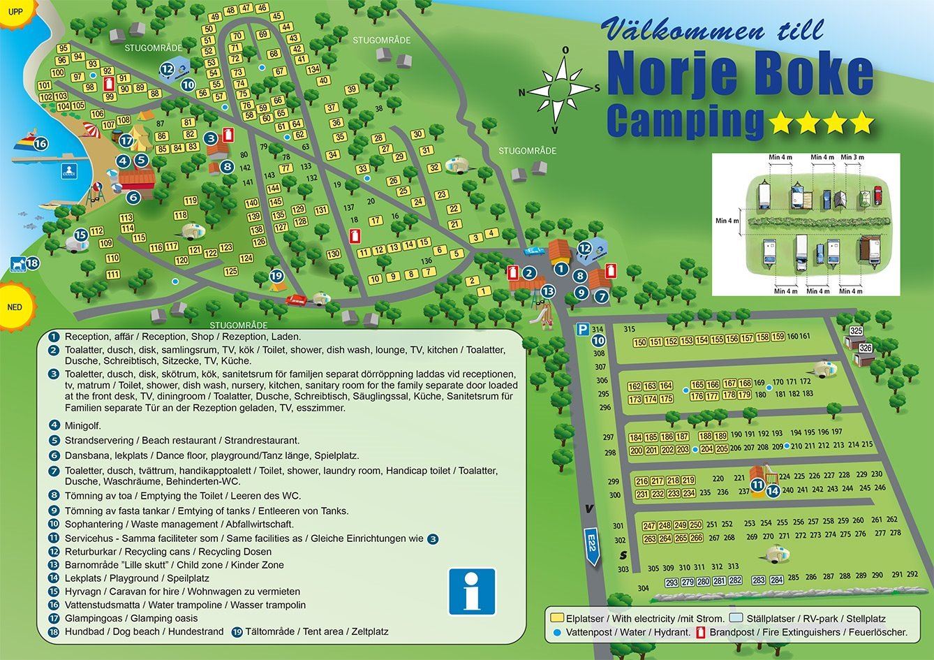 Auf Norje Boke Camping können Sie einen erholsamen Urlaub in einer wunderschönen Naturlandschaft mit lustigen Aktivitäten für die ganze Familie genießen. In der Hochsaison werden Tanzabende sowie verschiedene Unterhaltungsformen wie Musikquiz, Karaoke, Kinderdisco und mehr organisiert. Der Campingplatz verfügt an drei Tagen in der Woche über einen Kinderclub, einen Wasserpark am Meer und einen Spielplatz mit ua Karussellschaukel und Seilbahn.