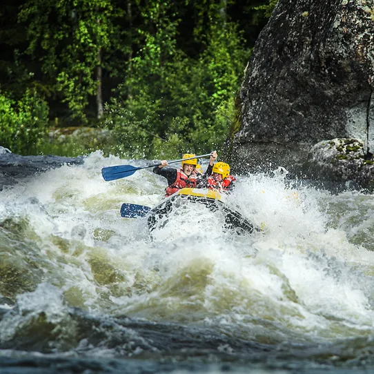 Abenteuer auf dem Fluss. Der Vindelälven ist einer der letzten naturbelassenen Flüsse in Europa. Unberuhrt, nicht kanalisiert und nicht für die Wasserkrafterzeugung ausgenutzt. Darum ister ideal für Rafting, das hier von Forsknäckarna veranstaltet wird. Hier können sich die Kräfte der Natur noch frei entfalten - ideal für tolle Herausforderungen und spannende Erlebnisse. Die rasantesten Abfahrten gibt es erst ab 18, aber auch Kinder ab sieben Jahre können sich schon Helme aufsetzen und eine Familientour auf dem Fluss unternehmen.