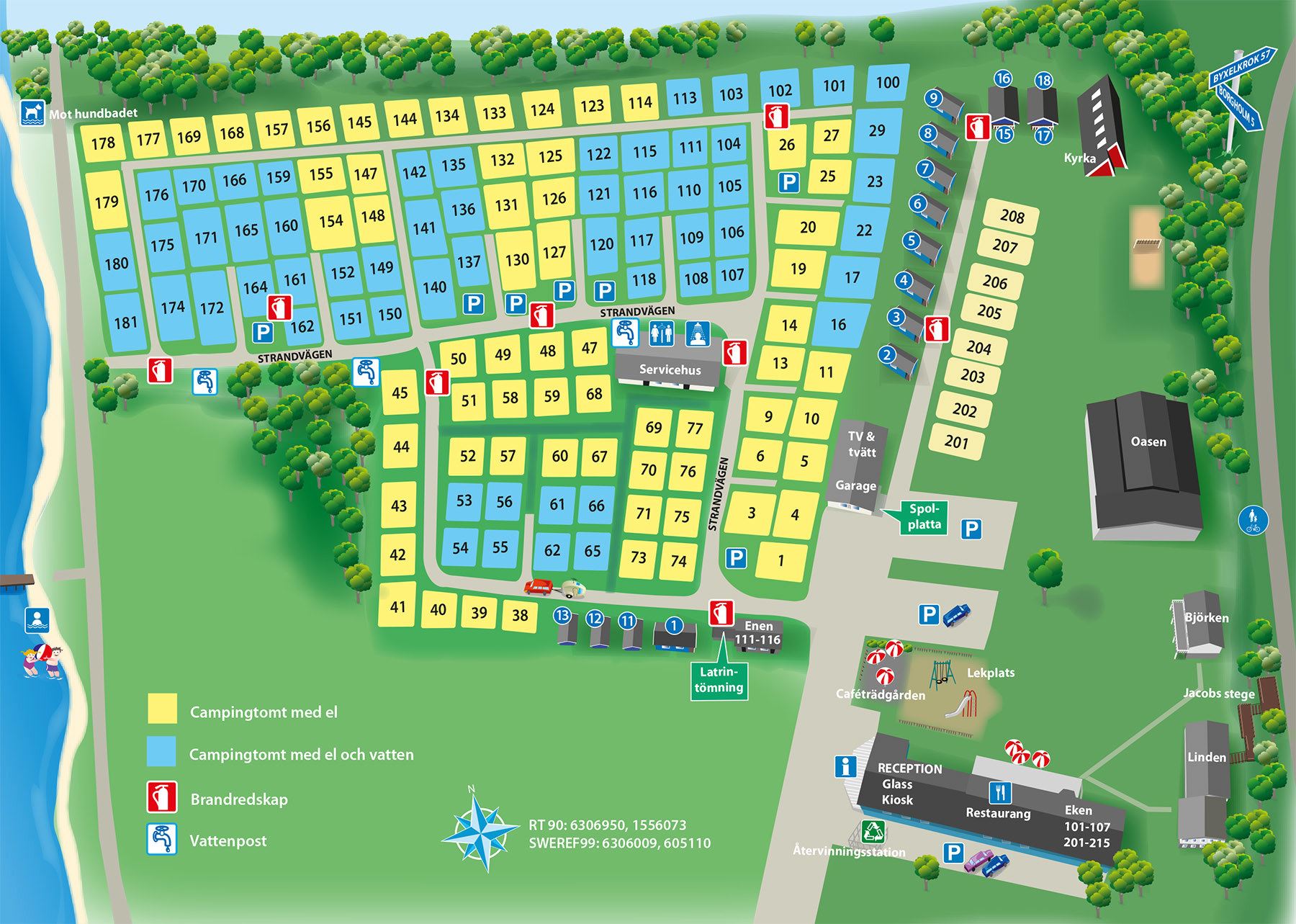 There are 140 pitches and 15 cottages. The sizes of the pitches are defined as small or large, and the majority have electricity. Wireless broadband, Telia Wi-Fi, is available in the grounds.