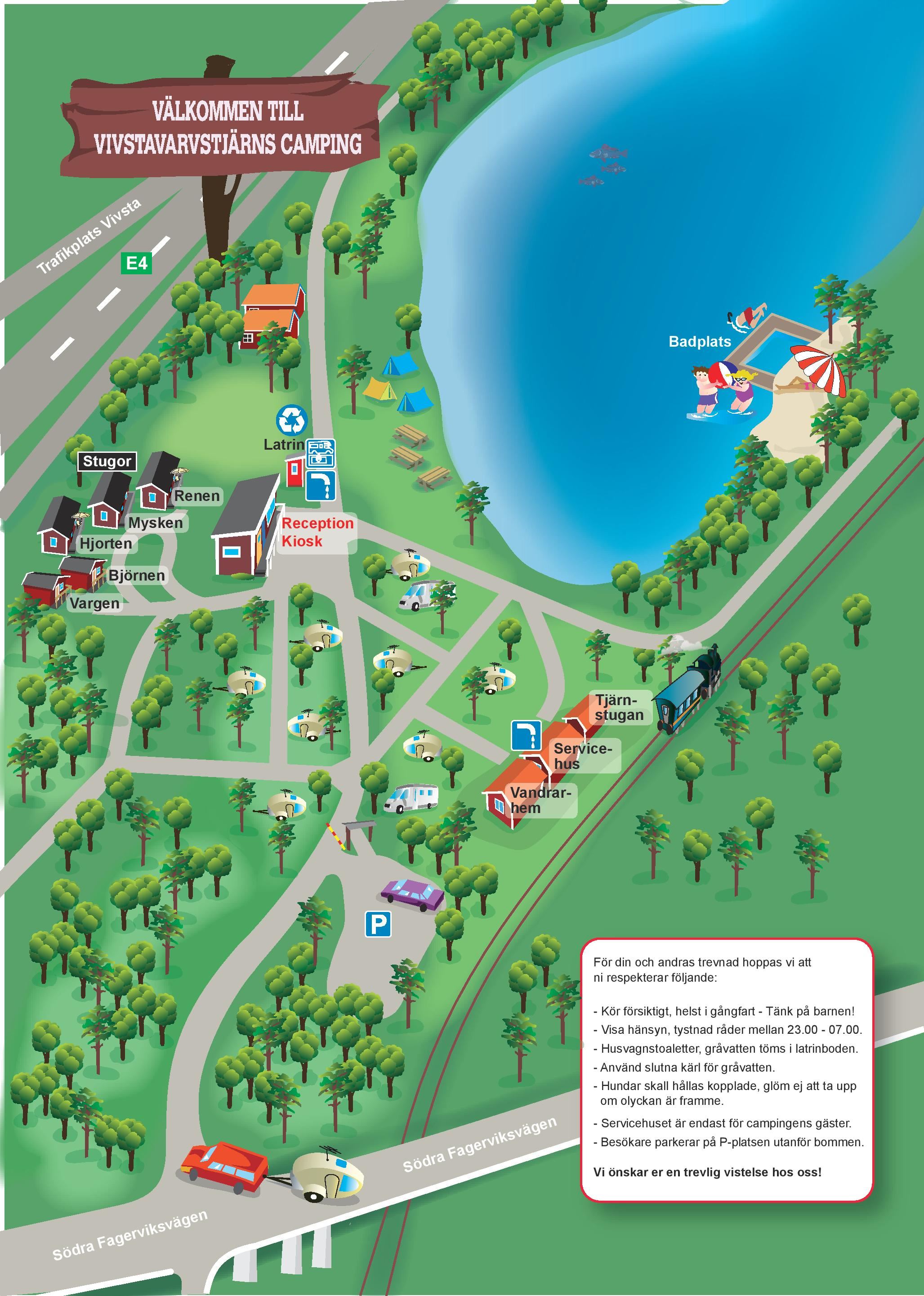 2026-05-07 - 2026-10-12If you arrive from the north on the E4, take the exit for E.ON Arena and Vivstavarv. Then take the exit for Vivstavarv off the roundabout (third exit to the right). The campsite is located directly after the roundabout and the first left before the railway (the right goes to Timrå). If you arrive from the south, after the E4, take the exit for E.ON Arena and Vivstavarv. Then take the exit for Vivstavarv off the roundabout (first exit to the right). The campsite is located directly after the roundabout and the first left before the railway (the right goes to Timrå). From the centre of Timrå, follow Köpmangatan north to the end. The E4 is on the left and Vivstavarv and the railway on the right. Cross the road and continue down the turning to Vivstavarvstjärns Camping.