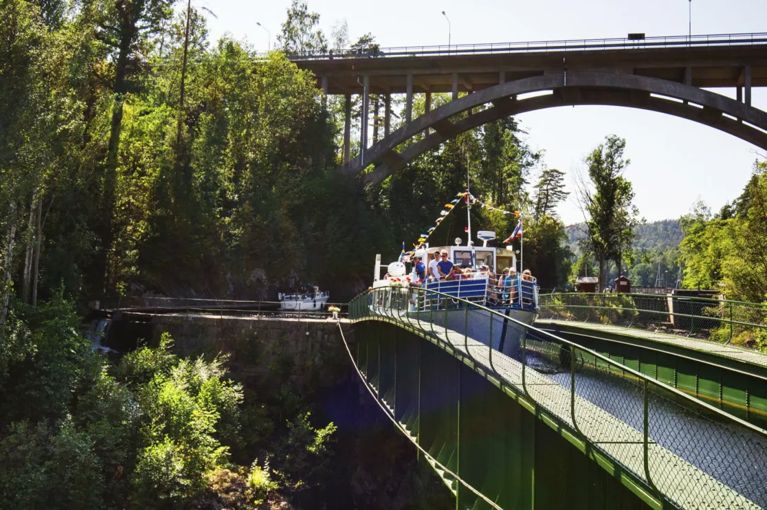 Mer sentida arkitektur hittar du vid Akvedukten i Håverud. Här är strömmen stark och väggarna branta, så en lösning behövdes för att skepp skulle kunna passera lättare. Svaret blev en enorm plåtränna, eller akvedukt.