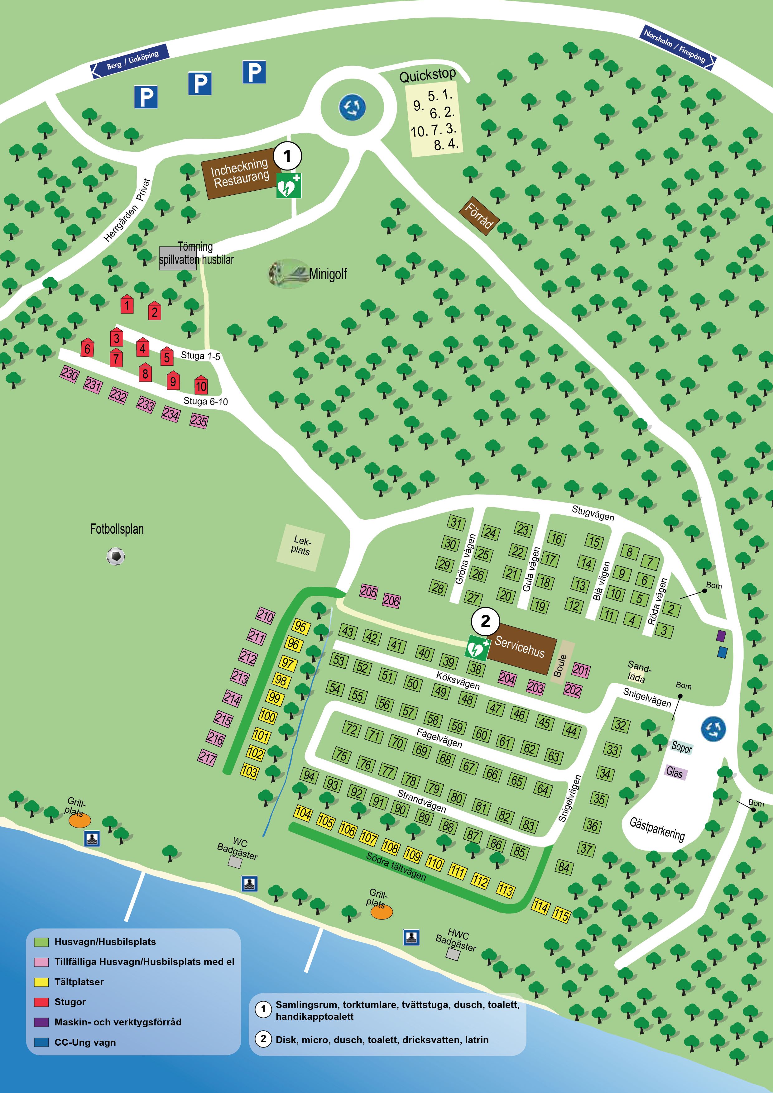 Sandviks familjecamping ligger vackert vid norra stranden av Roxen. Här finns flera gästplatser för såväl husbilar som husvagnar, samt 10 stugor att hyra.