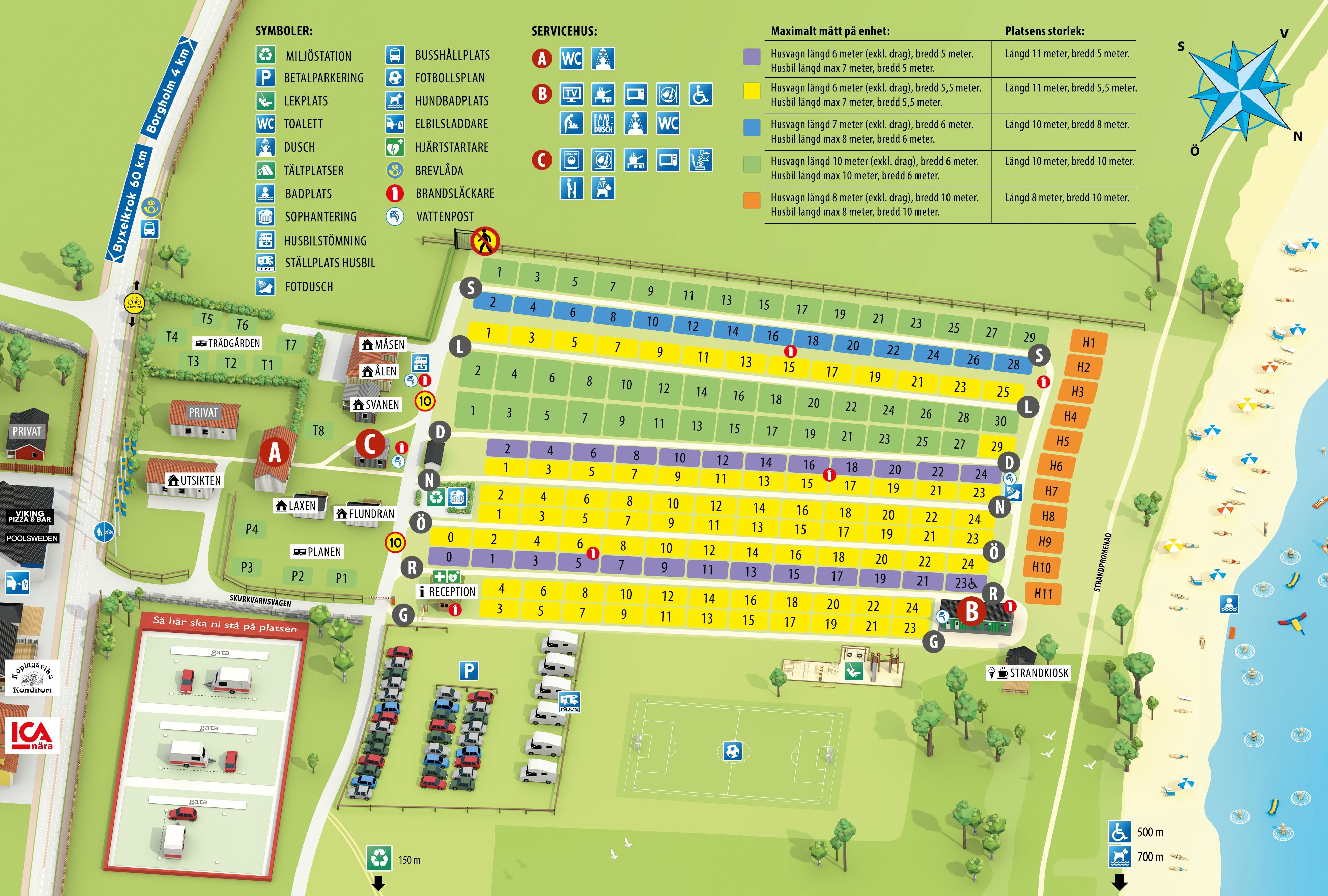 Antal tomter: 190 Antal säsongstomter: 60 Antal stugor: 5
