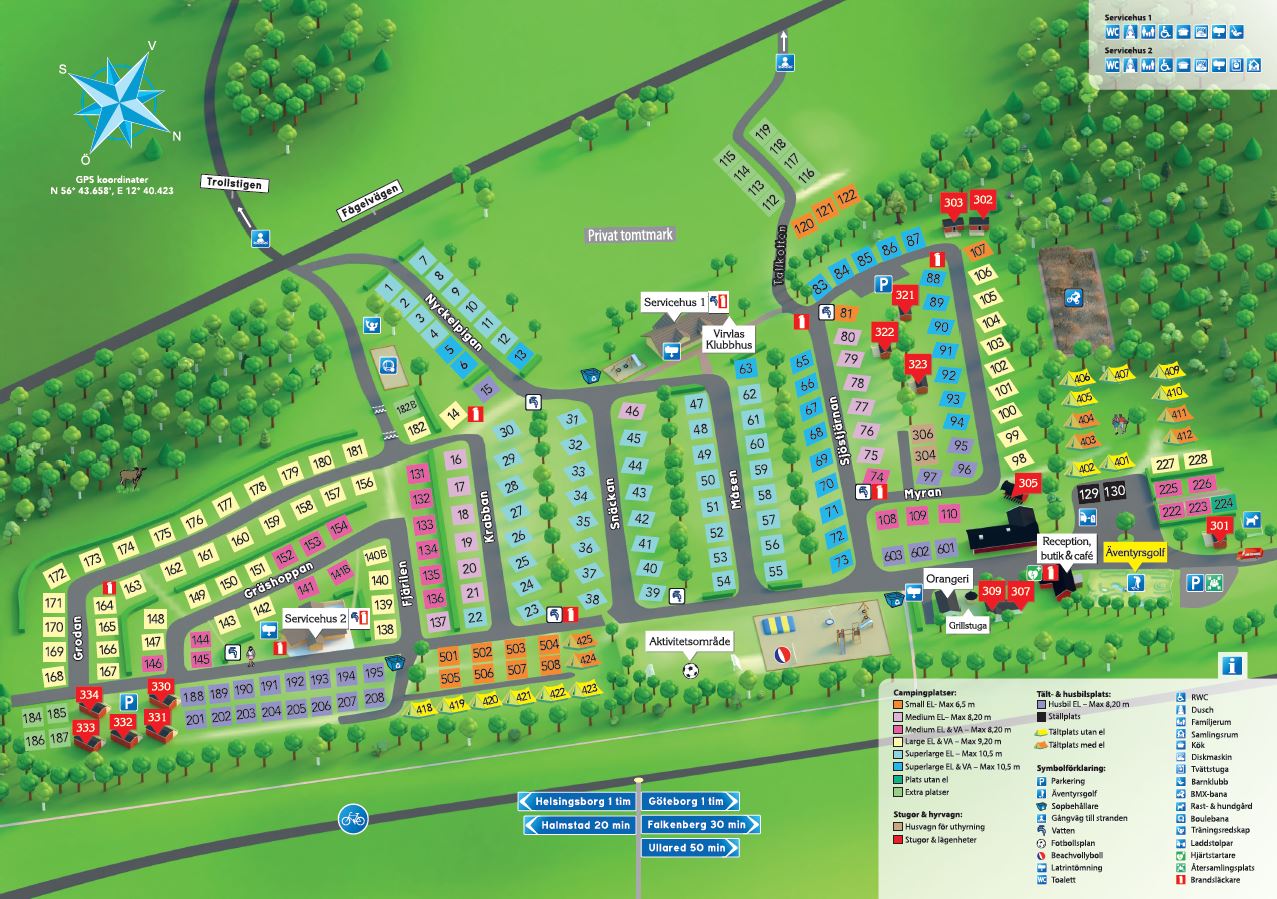 2026-04-01 - 2026-11-29Nära havet kustvägen 15 km N Halmstad. Avfart från E6 Nr 46 vid Kvibille. Haverdals Camping ligger 15km Norr om Halmstad. Nära havet utmed den vackra kustvägen mot Falkenberg. E6 söder ifrån: tag avfart nr.46 Haverdal/Kvibille. Följskyltarna mot Harplinge/Haverdal (campingskylten) . När du kommit in i Haverdal kör du till andra rondellen och svänger vänster (Haverdalsvägen) och sen första vänster så är Ni inne på Campingen. E6 norr ifrån: Tag avfart nr 47 Steninge/Getinge. Sväng vänster när Ni kommer av motorvägen följ vägen då kommer Ni till en T-korsning där Ni tar vänster (mot Haverdal/Halmstad) sen följer ni vägen (kustvägen) tills ni kommer till en rondell och då tar Ni av höger. Sedan första vänster så är Ni inne på Campingen. Ha en trevlig resa! Välkomna!