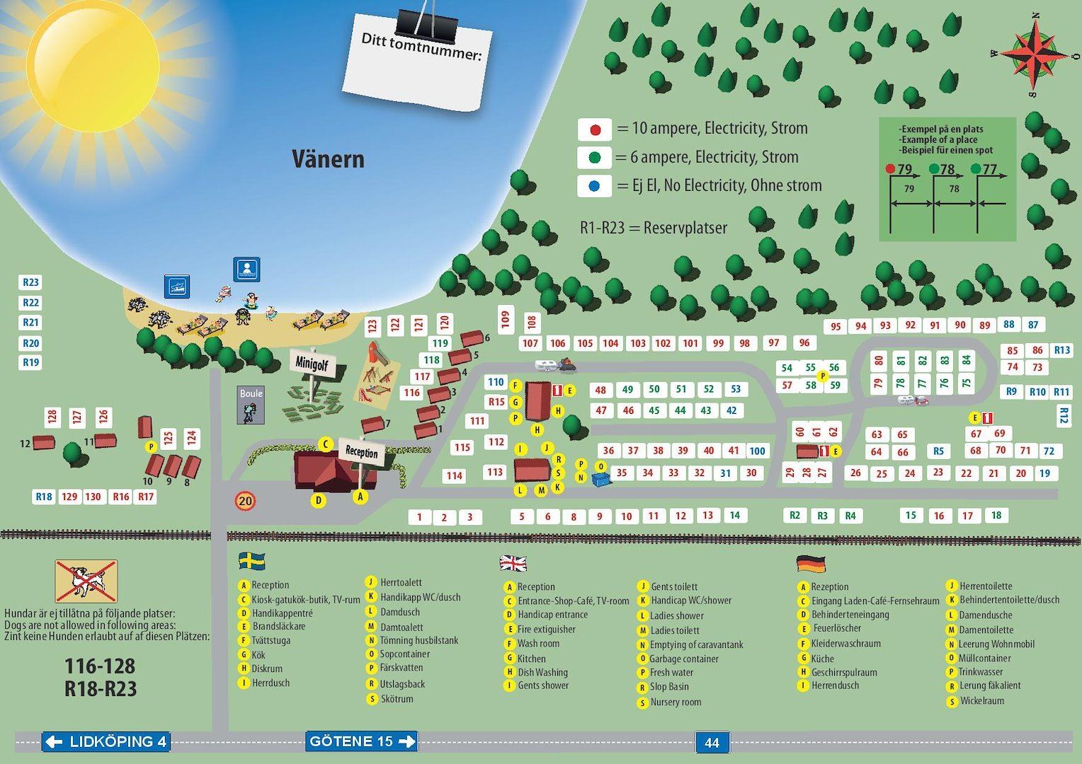 På anläggningen finns minigolfbana, boulebana, lekplats, tv-rum och cykeluthyrning (det går en cykelbana in till Lidköping centrum). Och sist men inte minst badplats inom campingområdet.