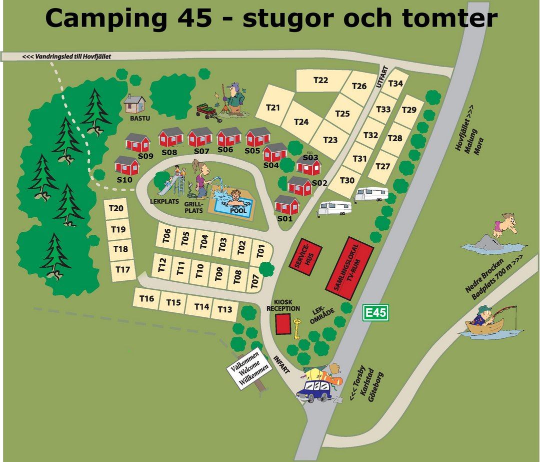 Vid foten av Hovfjället Naturreservat i Värmland, ligger Camping 45 intill väg E45. En familjvänlig campingplats med pool, bastu, båt- och cykeluthyrning. Här kan du njuta av ett lungt naturnära boende som är öppet året runt. Campingplatsen är miljömärkt med Green Key.