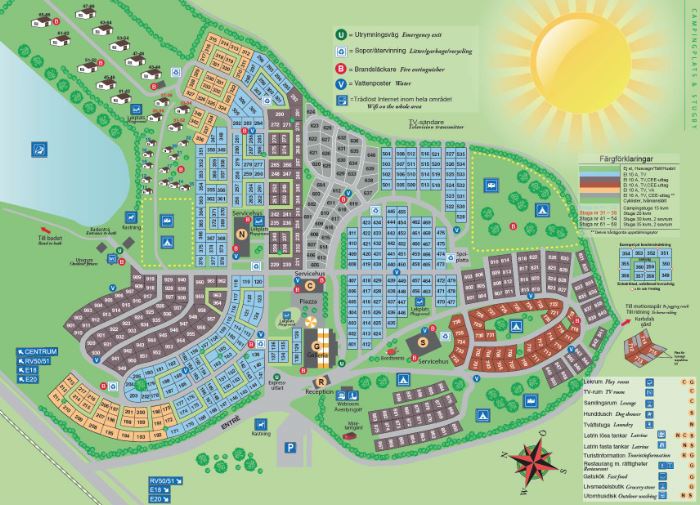 På campingplatsen finns 665 stora tomter, de flesta utrustade med el och kabel-TV. Du kan koppla upp dig mot gratis wifi över hela campingområdet. Det finns tre exklusiva servicebyggnader med tillgång till dusch och toalettutrymmen med barnhygienrum. Du hittar också utrymmen och utrustning för matlagning och disk, tvättstugor med tvättmaskiner och torktumlare samt lekrum och TV-rum.