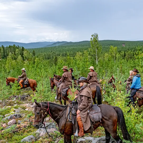 Vi gungar med i hästarnas rörelser, tjoar och njuter av fartvinden, tillsammans med några nyfunna ryttarvänner. Ritten fortsätter över vidsträckta tallhedar, hästarna vant söker sig fram i terrängen. Efter ett par timmar är det lunchdags uppe på en av bergåsarna, där Rikard med van hand ordnar en sprakande brasa.