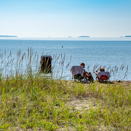 De sitter i varsin solstol utanför husbilarna med havet ett 20-tal meter bort.