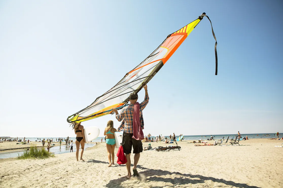 – Jag tycker om vatten. Hittills har jag mest vågsurfat, men egentligen gillar jag fart. Vindsurfing passar mig bättre, men då måste man vara ute när det är tråkigare väder, säger Hedda Strandberg och släpper ner sin bräda i det glittrande havsvattnet. Några sekunder senare har alla dragit i väg åt var sitt håll. Långt bort i fjärran ser man hur någon är ute och motionspaddlar. På grunt vatten provar en sexårig tjej stand up paddle board, SUP, för första gången. Det ser inte det minsta vingligt ut. Tvärtom, och många av badgästerna spanar nyfiket åt surfarnas håll.